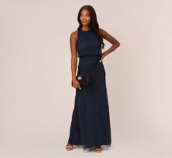 Create a high impact look at your next formal event when you choose this beautiful, beaded evening dress. For that upcoming wedding or gala, this special occasion gown features a blouson bodice, sparkling scalloped beading, and a flowing straight skirt. The back features a zipper closure and keyhole detail. Pair this beautiful sleeveless evening dress with chandelier earrings and a sleek metallic clutch for a jaw-dropping look sure to turn heads all evening.