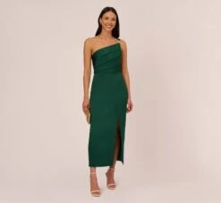 No matter the event, this mermaid gown is the main event. This formal dress features a crew neckline, long split sleeves that give a cape-like look, and crystal embellished shoulders. Crafted from crepe fabric, this dress has some stretch and no waist seam for a comfortable fiton all body types. A zipper closure at the back of the dress completes the design. Style this mermaid gown with striking metallic accessories to complete the look.