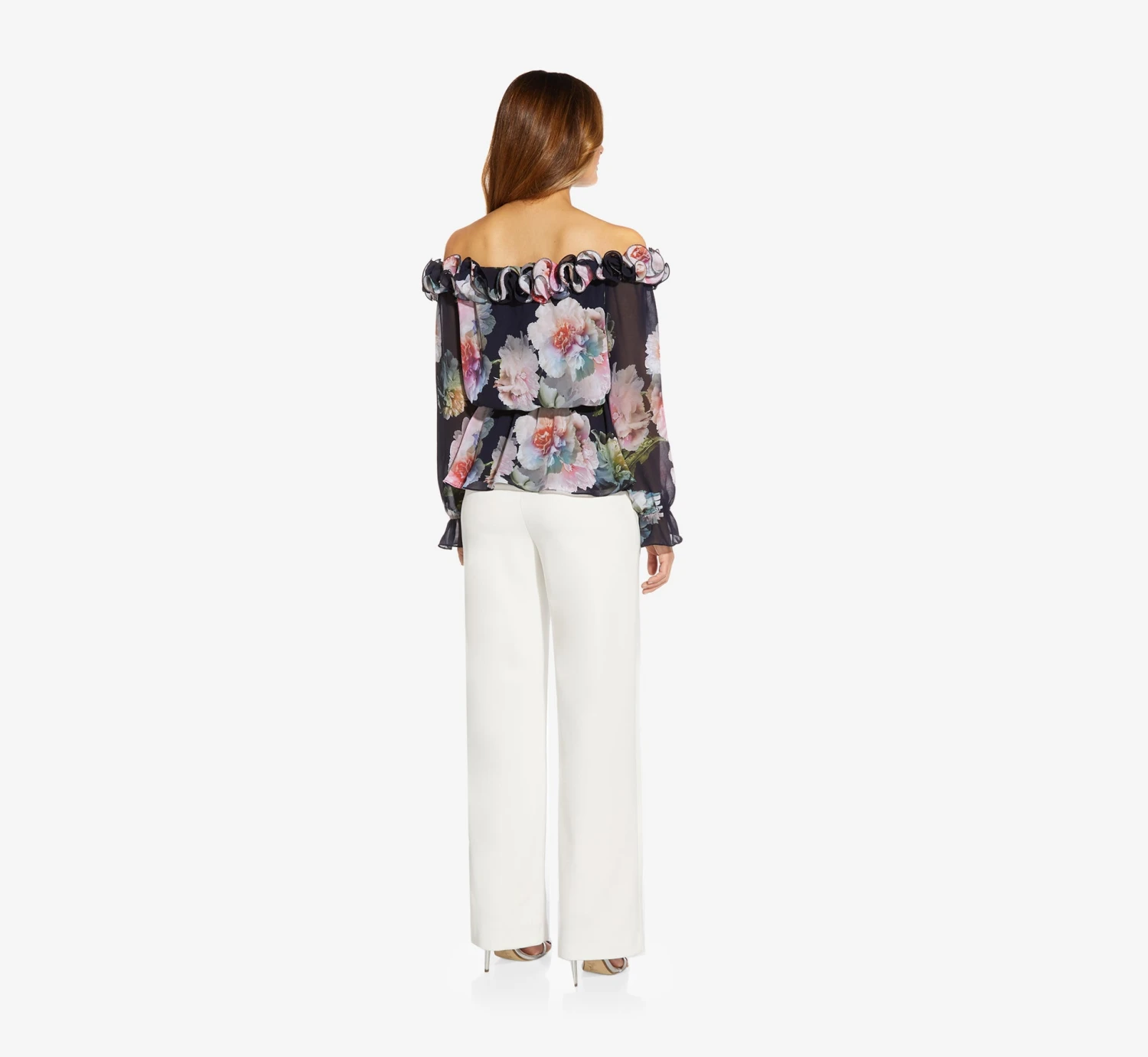Flower power! Our off-the-shoulder blouson blouse in a soft, lightweight woven chiffon, blooms with this season’s prettiest print — florals. A dramatic rosette accent and long sleeves with a dainty bell cuff finishes the look. A gorgeous top to wear with your favorite wide-leg pants or pencil skirt.