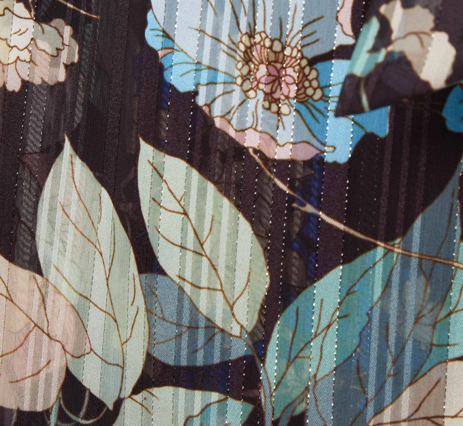 Lightweight and airy, this timeless faux wrap dress is designed in a floral printed woven chiffon with satin stripes and metallic threading for added shine. Features a surplice bodice, three-quarter blouson sleeves with elastic hem. Short wrap skirt with cascading ruffle for added dimension. Finished with a detachable self-tie belt. Back zipper with hook and eye closure.