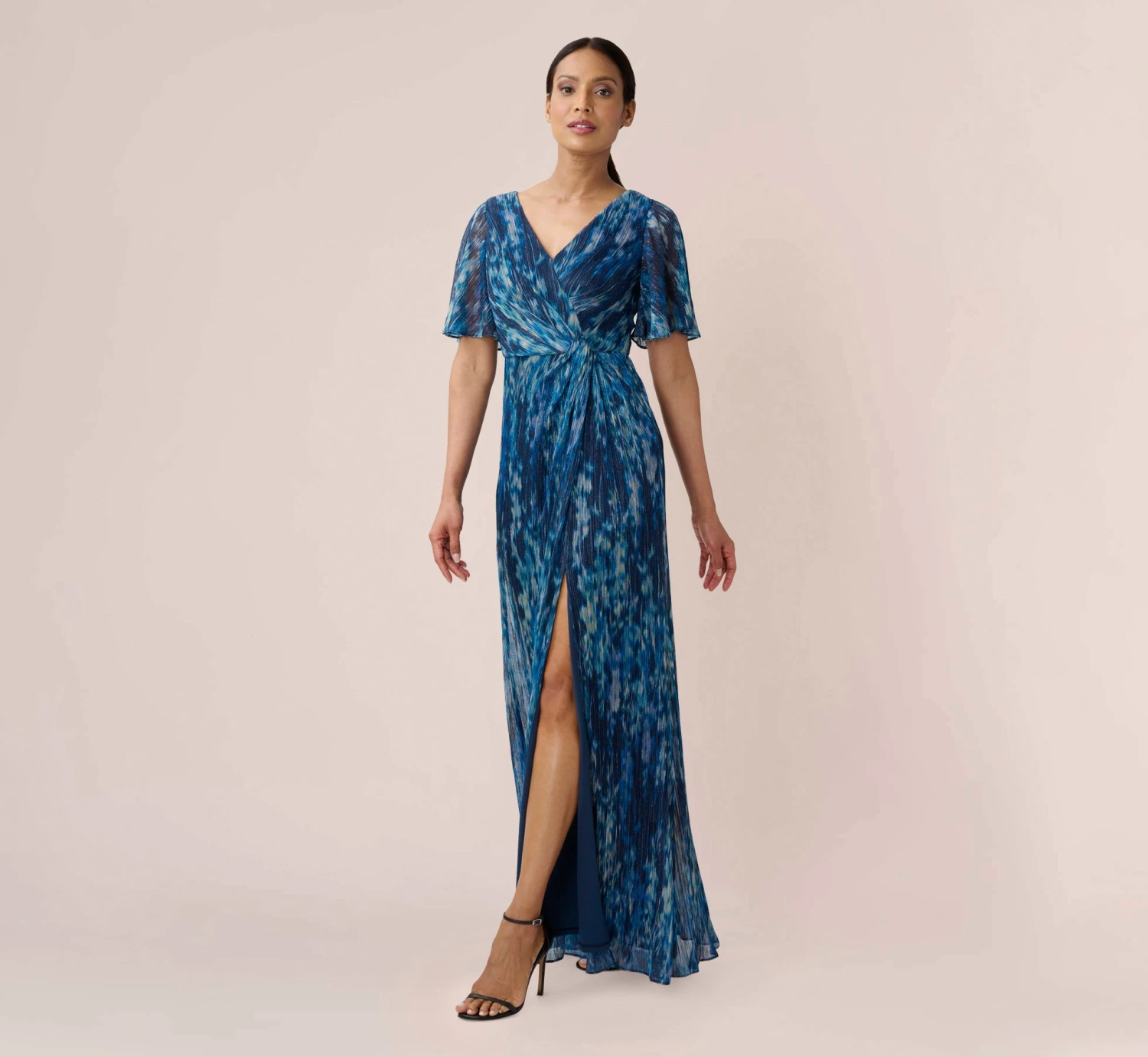 Lightweight and airy, our faux wrap long gown features an eye-catching watercolor floral print on an easy-fitting metallic mesh. We love the figure-flattering faux wrap bodice with pleated detail and the softly draped modified mermaid skirt with front slit opening. All the details: chic sheer flutter sleeves and back zip closure.