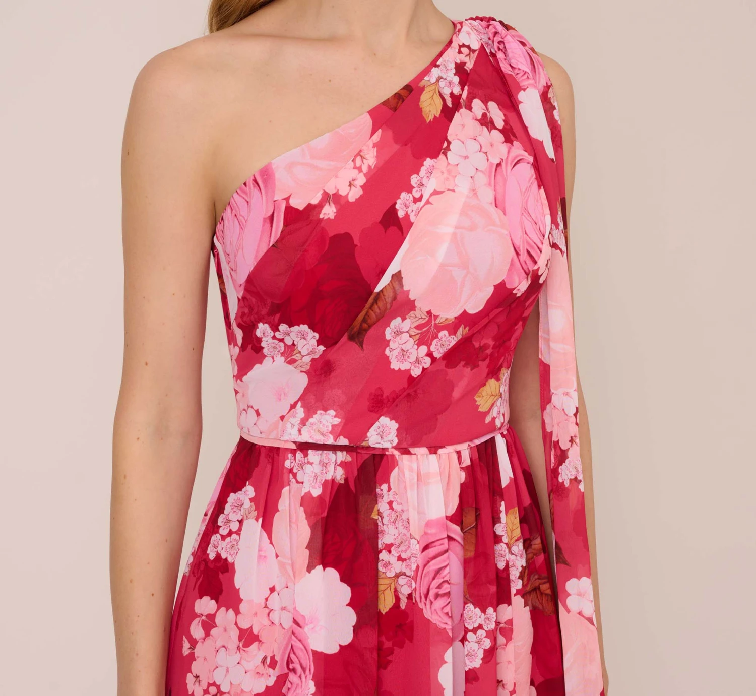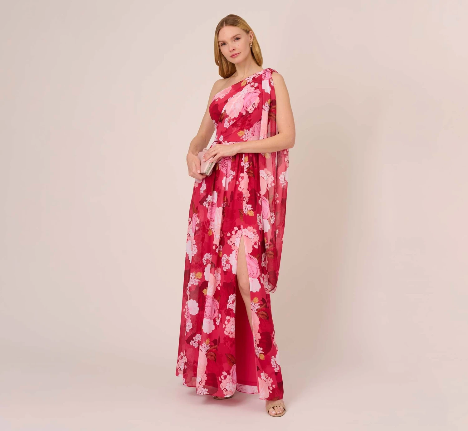 Lightweight and airy, our woven chiffon gown is printed in a bold floral and impeccably tailored in a one-shoulder silhouette with a playful bow at the shoulder. The floor-sweeping skirt is designed with pleating for added movement and sway. Front slit for dramatic effect. Side zipper with hook and eye closure.