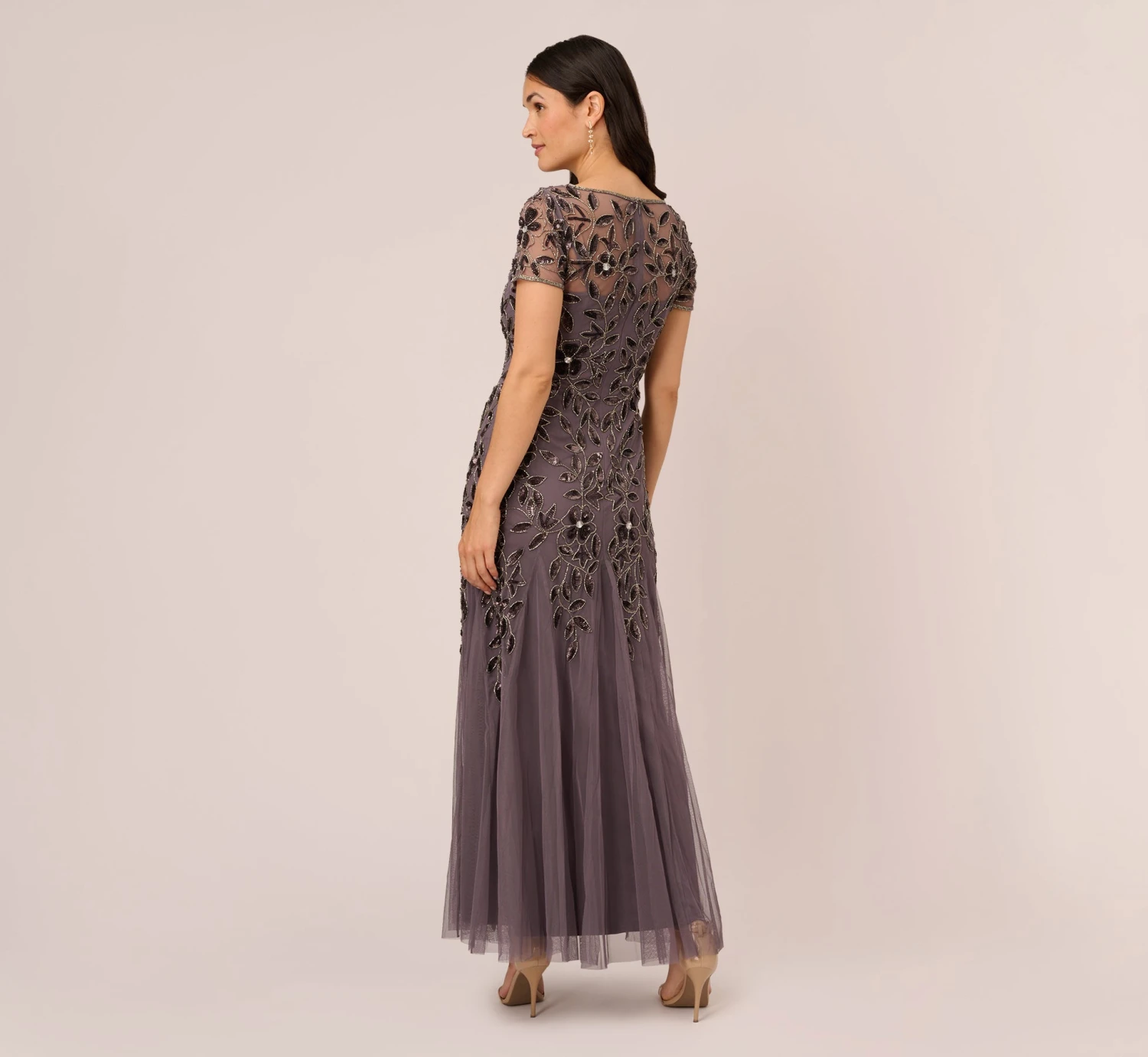 A work of art: our long and romantic gown dazzles with allover handsewn beading in a feminine floral pattern that catches the light with every twirl. A streamlined silhouette is eased with the mermaid skirt with godets to create the right amount of movement. All the details: our iconic (and flattering) no waist seam, sheer illusion yoke and cap sleeves. Sleek back zip closure.
