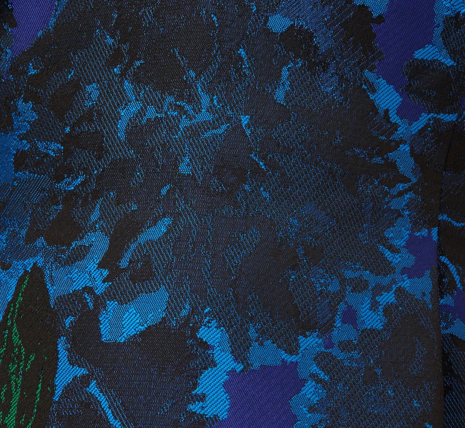 Timeless details and luxurious fabric make this sleeveless jacquard dress a classy styling. This party dress features a sleeveless surplice bodice with deep v-neckline, a high-low pleated skirt, and ruffled details at the neck. Crafted from a metallic floral jacquard, this high low dress is a luxurious look and has convenient pockets. A zipper back closure and v-back complete this cocktail dress. Styled for a shower with nude heels or for a semi-formal wedding with metallic accessories, this jacquard dress is a versatile look.