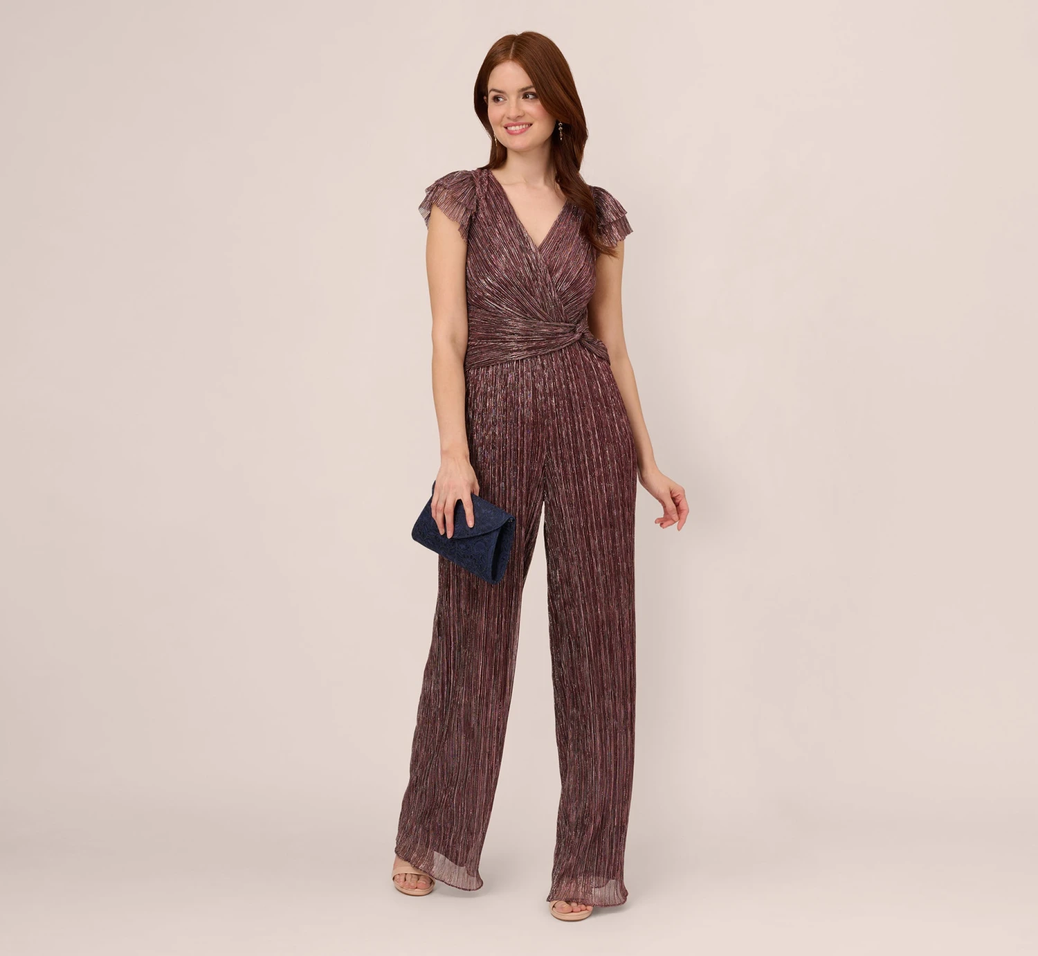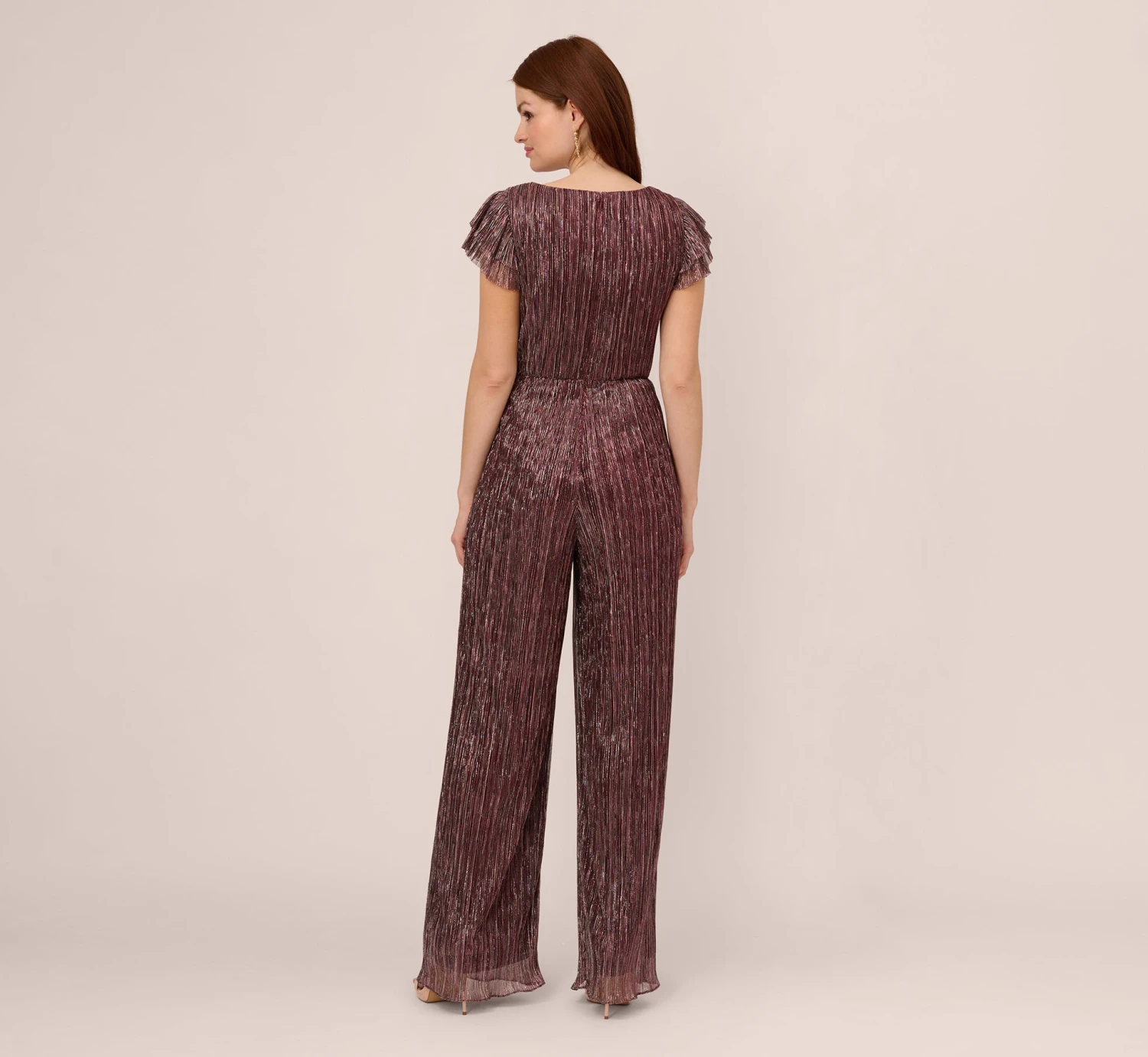 Shine meets style in this short sleeve jumpsuit. This dressy jumpsuit features a surplice bodice with ruffled short sleeves and a v-neckline, a knotted accent at the waist, and wide-leg pants. Crafted from a crinkle-knit, metallic fabric, this semi-formal jumpsuit has a subtle sparkle when it catches the light. A zipper closure at the back completes this design. Styled with metallic heels and a beaded clutch, this jumpsuit is ready for any cocktail party or black-tie wedding.
