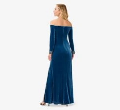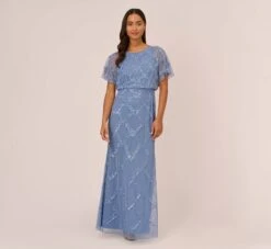 Classic and shimmering, our long gown fashioned from a crinkled-textured mesh is finished with an eye-catching metallic shine. We’re obsessed with the twisted, gathered detail at the waist that flatters your figure. All the details: a faux wrap bodice, long bishop sleeves and a mermaid-style skirt with cascading overlay. Sleek back zip closure.