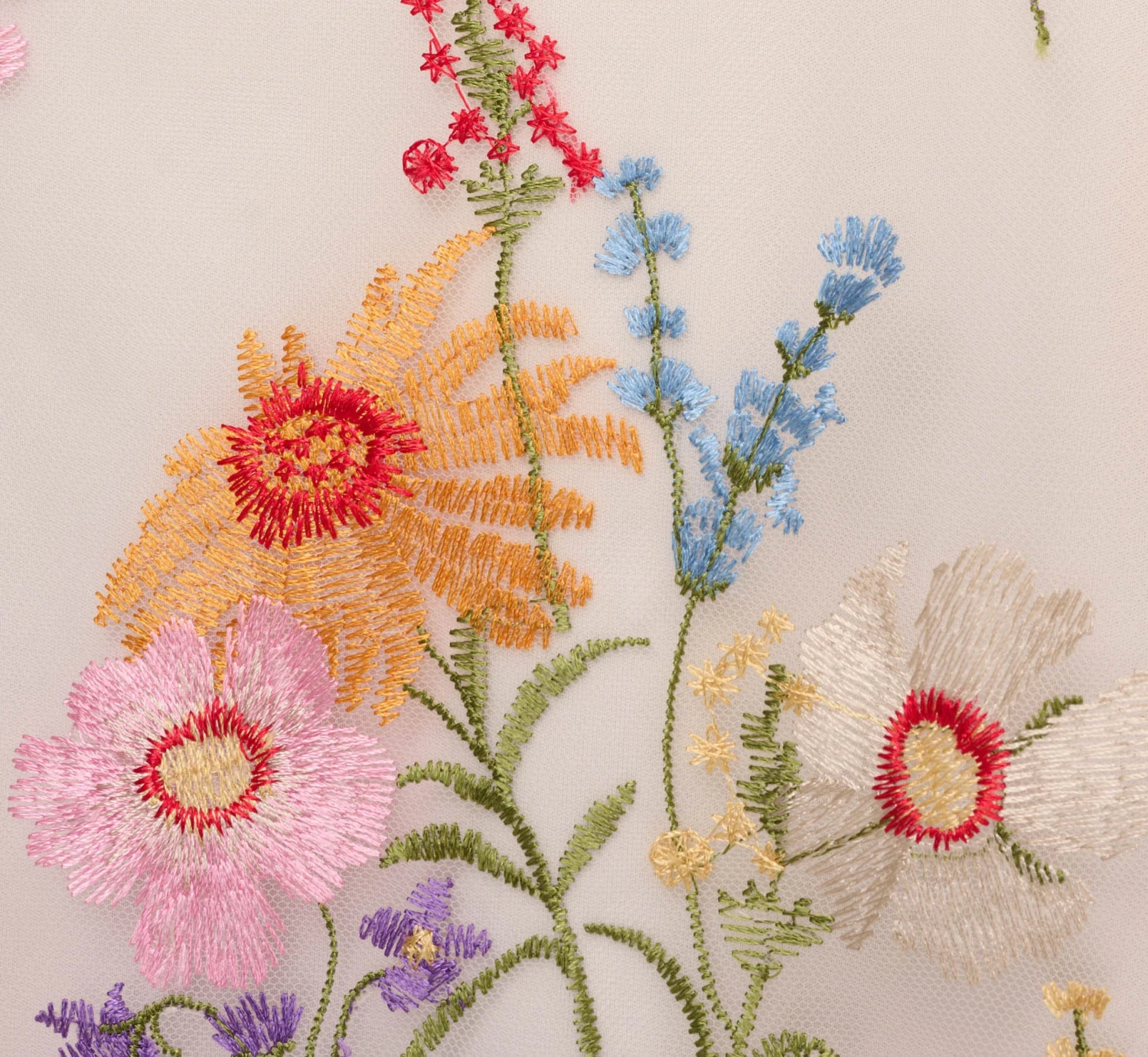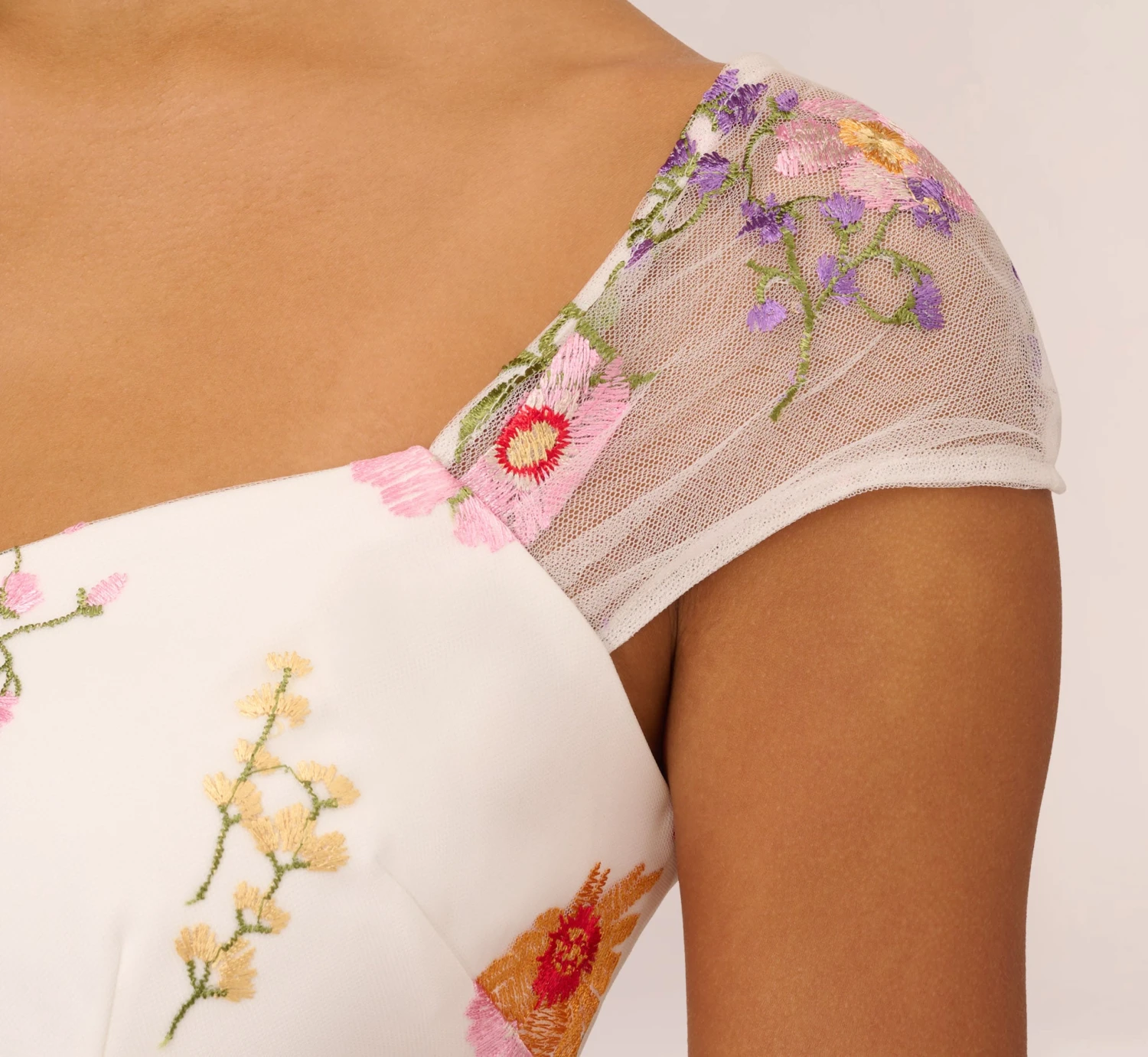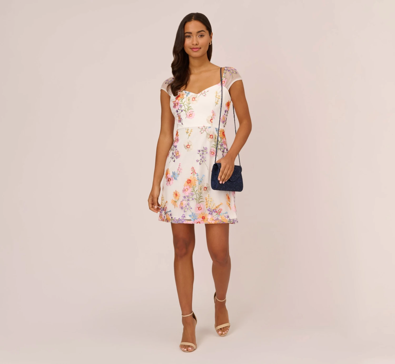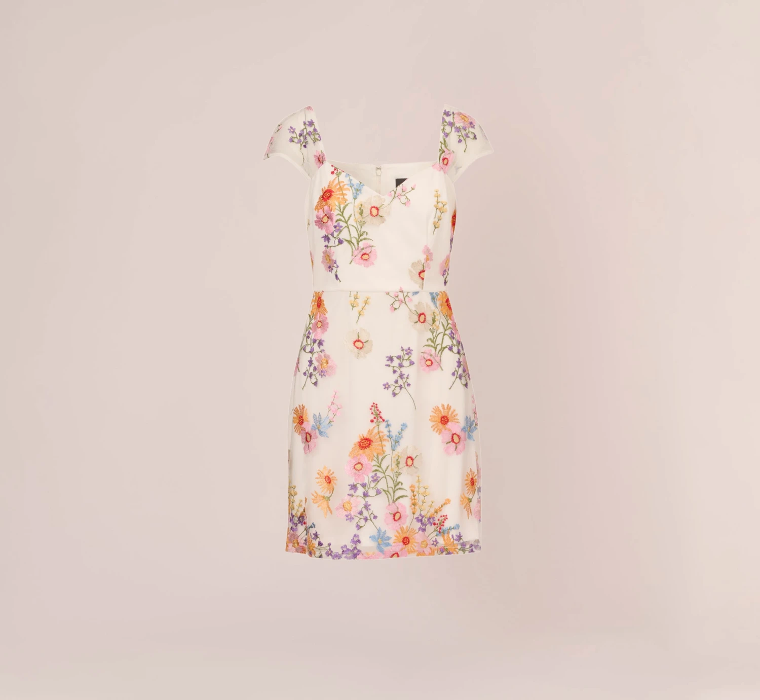 Bring the bloom in this bright and beautiful embroidered dress. This floral dress features a v-neckline, an a-line silhouette, and sheer cap sleeves with delicately pleated details. Bright flowers are embroidered throughout this pretty a-line dress. Paired with neutral or metallic heelsand a clutch, this floral embroidered dress will shine for day or night.