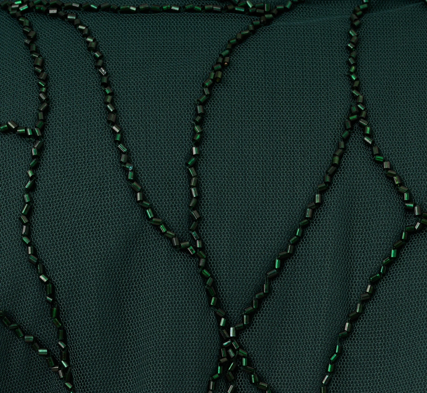 An unforgettable night out starts with this short sleeve beaded gown. This formal dress features a blouson bodice with v-neckline, sheer dolman sleeves, and a soft mermaid skirt. Lined through the body and overlaid with sheer mesh covered in lines of sparkling beads, this evening gown is a timeless style. A zipper closure at the back completes the short sleeve gown. Perfect for black-tie and formal events, this beaded dress will shine with nude heels and a contrasting clutch.