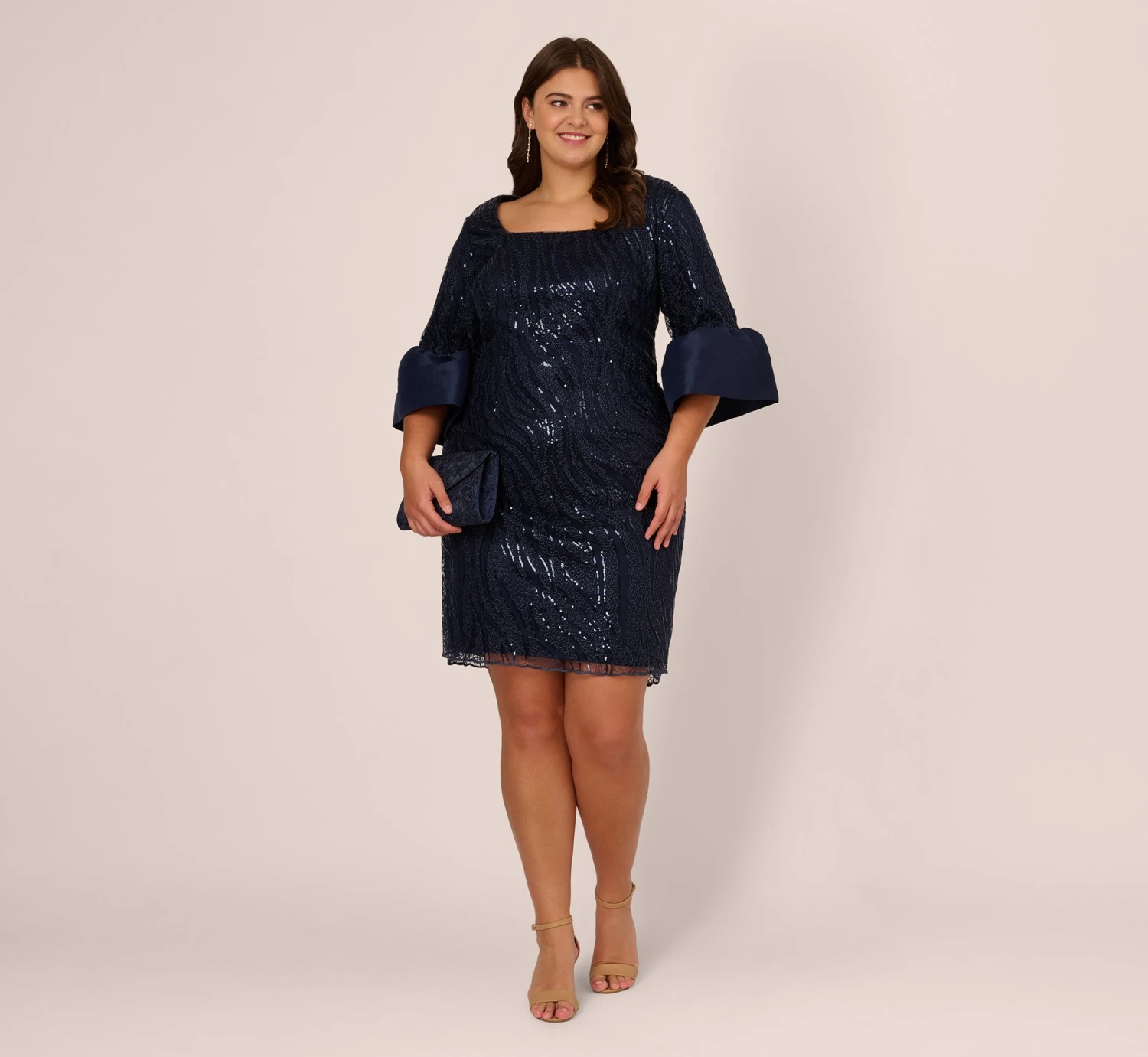 Perfect for cocktail attire and semi-formal events, this sequin dress is a sweet little style. This party dress features a sheath silhouette, square neckline, and three-quarter bell sleeves with taffeta cuffs. A swirl of sequins on elegant lace elevates this sheath dress. A zipper closure atthe center back completes this design. Styled with nude heels and statement earrings, this bell sleeve dress is a memorable look.