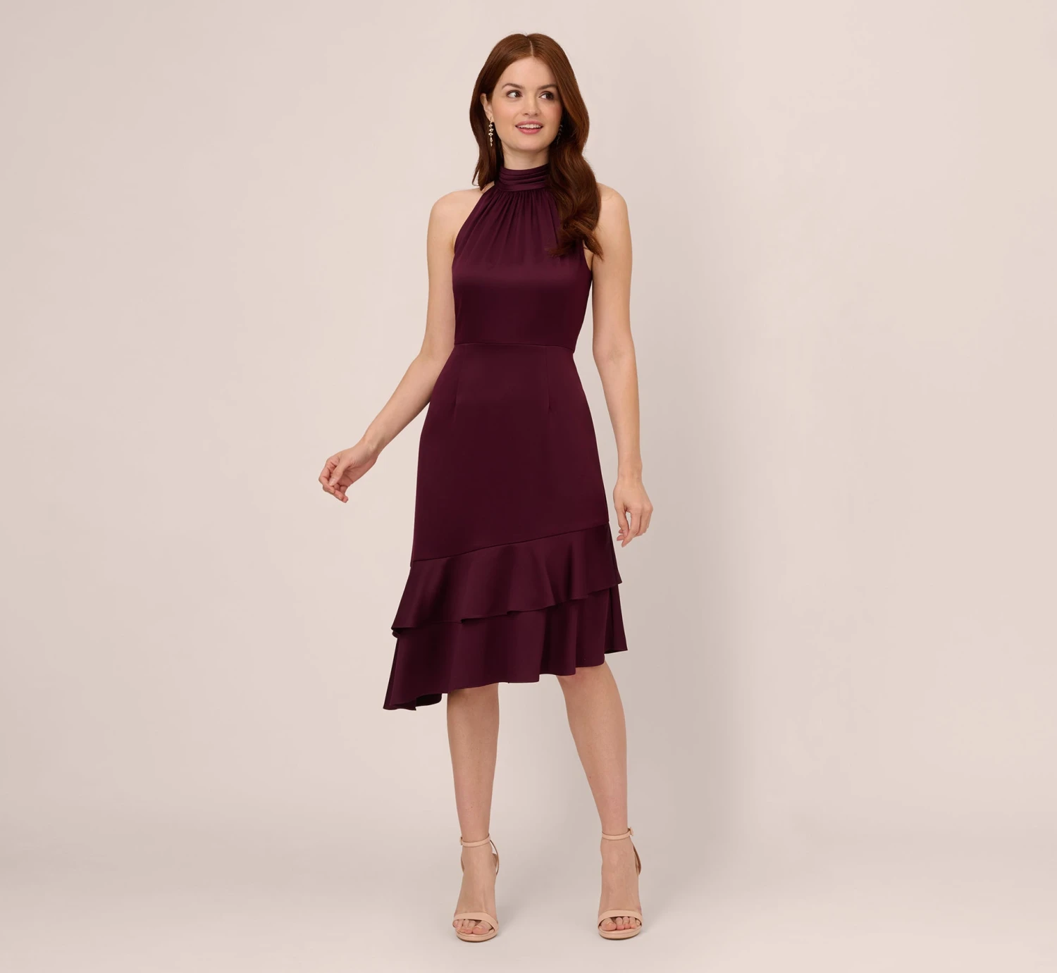 From work to cocktail parties, this midi dress will be right at home. This day dress features a sleeveless, halter bodice with a mock neckline, a flounce skirt with dual ruffles, and an asymmetrical hem. Crafted from chic satin crepe fabric, this dress has some stretch and a beautiful sheen. A zipper closure at the back finishes the design. Teamed with a closed-toe pump or a strappy heel to dress it up, this mock neck dress is complete.