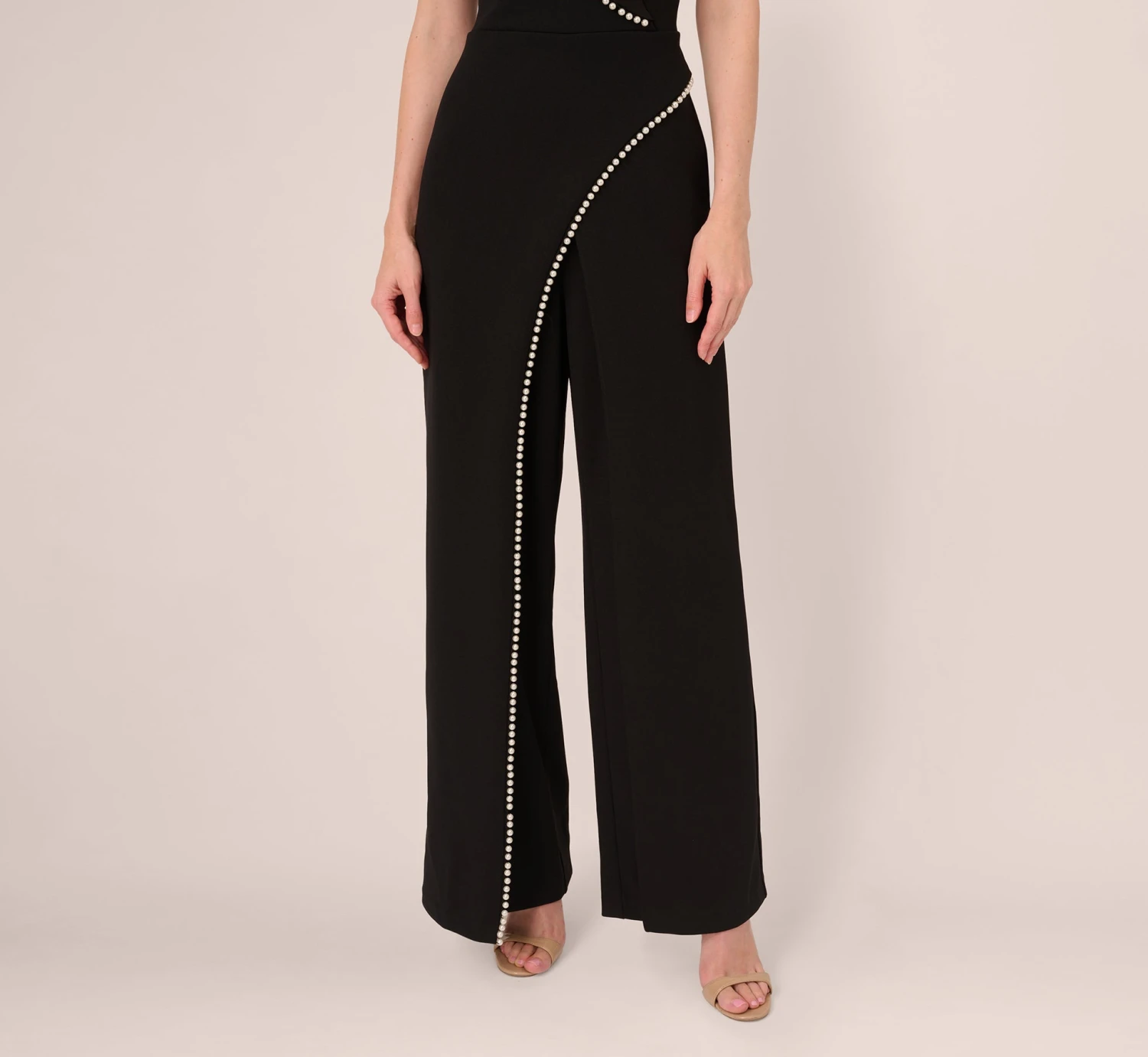This sleeveless jumpsuit is a gem! This jumpsuit features a sleeveless bodice, wide legs, and a surplice neckline. A charmeuse collar adds shine and contrasts the solid crepe knit fabric. An overlay trimmed in elegant pearl beading adds dramatic flair to this otherwise simple wide leg jumpsuit. A zipper closure at the center back completes this formal jumpsuit. Styled for a cocktail party with lowkey accessories or dressed up for a formal occasion with sparkling jewels, this tuxedo jumpsuit will be the crowning jewel of your closet.