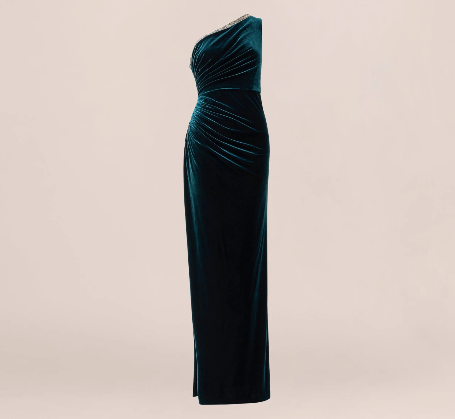 Subtle sparkling details are the prettiest, and this velvet gown is no exception. This formal dress features a one-shoulder neckline adorned with beaded trim, a column skirt, and gathered details at the side that drape down the body. Designed with a soft, luxe velvet, this column gown hasplenty of shine. A zipper closure at the side of this one shoulder dress completes the look. Add metallic high heels and a sparkling clutch to finish this black-tie gown off.
