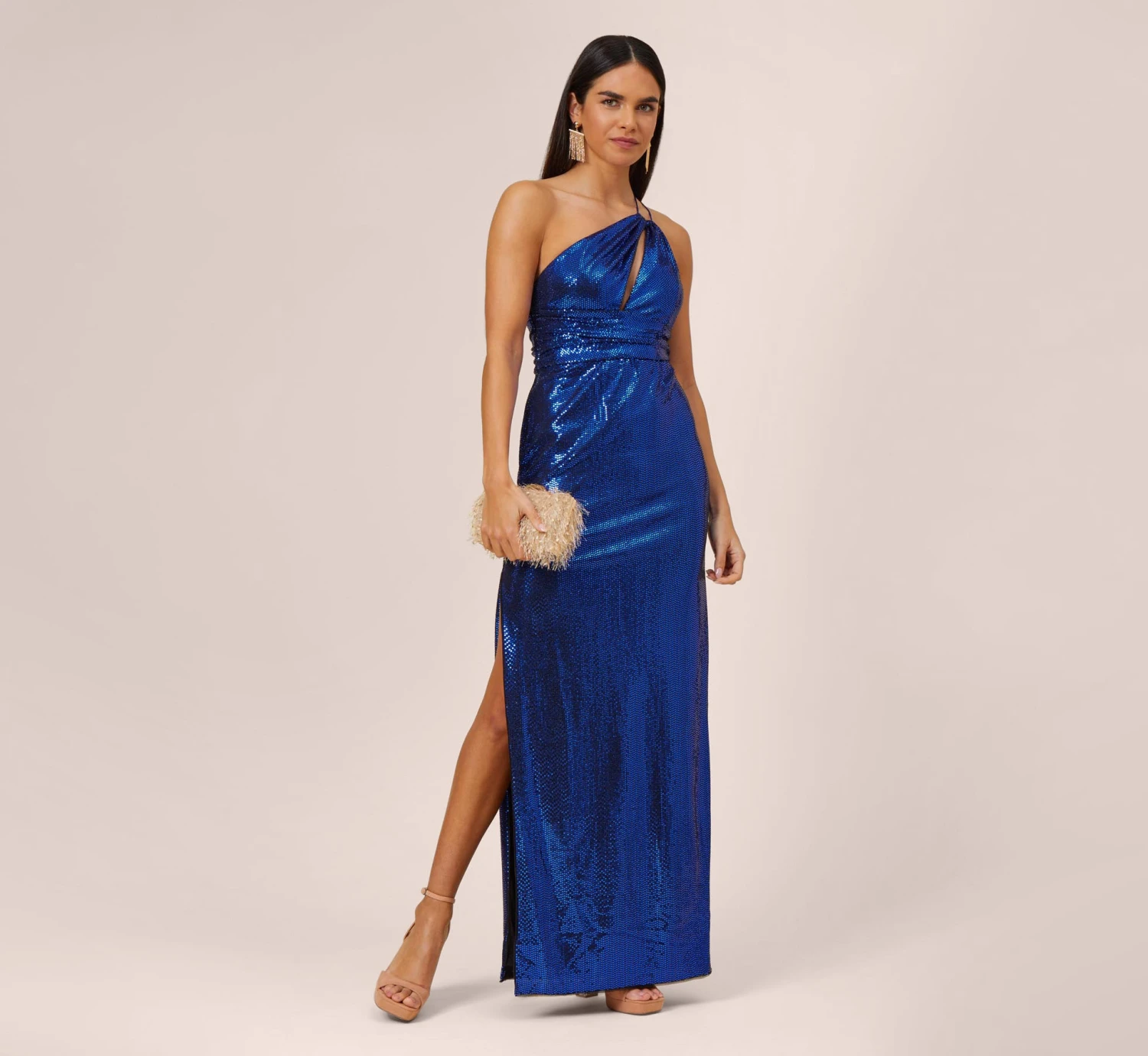 This one shoulder design hugs your curves in all the right places and features an alluring asymmetric bodice with pleated waistband. A striking cutout and thigh-high side slit turn up the volume on its dramatic appeal while the metallic knit fabric adds a glamorous touch. Side zipper with hook and eye closure. Be daring and bold in this showstopping number at prom, wedding celebrations and black-tie galas.