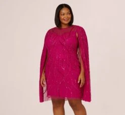 Adrianna Papell Plus Size Sequin Beaded Cape Dress With Illusion Neckline In Hot Orchid