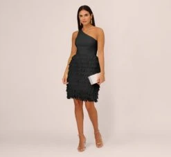 One Shoulder Cocktail Dress With Feather Chiffon Skirt In Black