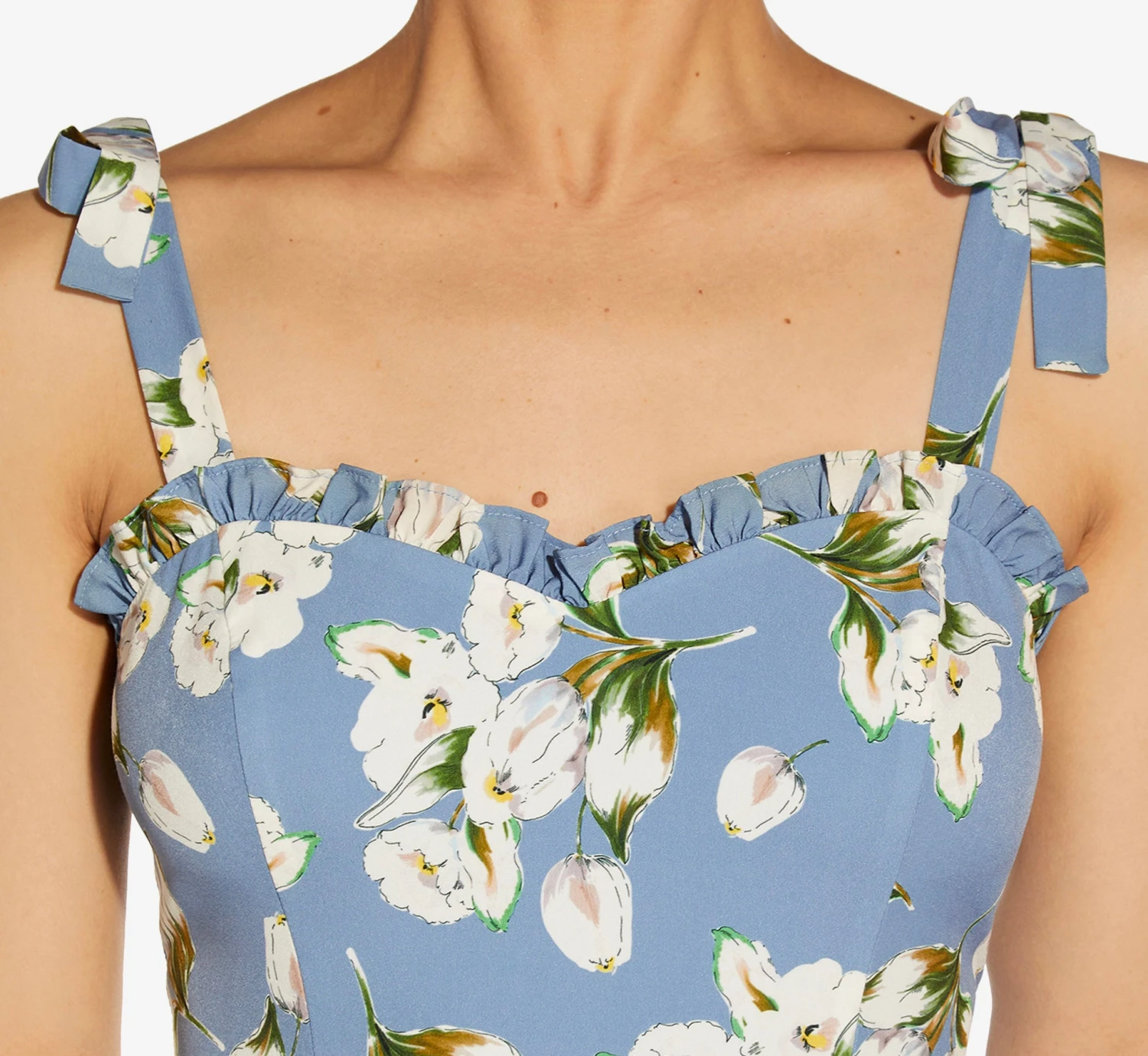 You’ll cut a striking figure at your next special occasion. Out charming maxi dress is crafted of a lovely and lightweight woven crepe in a lovely floral print. All the chic details: delicate tie shoulders, sweetheart neckline with ruffled accent and seamed waist. The long skirt is finished with gently pleating for added fullness. Sleek back zip closure.