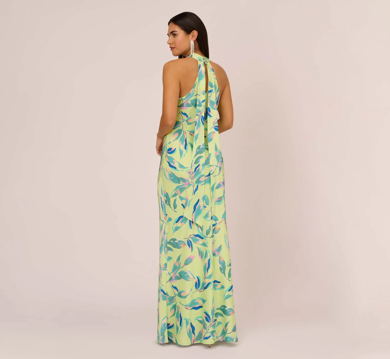 Show off this season with this show-stopping satin gown. This formal dress features a fitted bodice with halter neckline, mermaid skirt, and a keyhole back flanked by trailing cape details. Crafted from satin fabric covered in a multicolor foliage print, this dress has some stretch andwill add a bright touch anywhere it goes. Styled with neutral heels and a rattan statement jewelry, this dress will exude confidence.