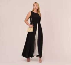Adrianna Papell Plus Size Colorblock Matte Crepe Cropped Jumpsuit With Skirt Overlay In Black Ivory