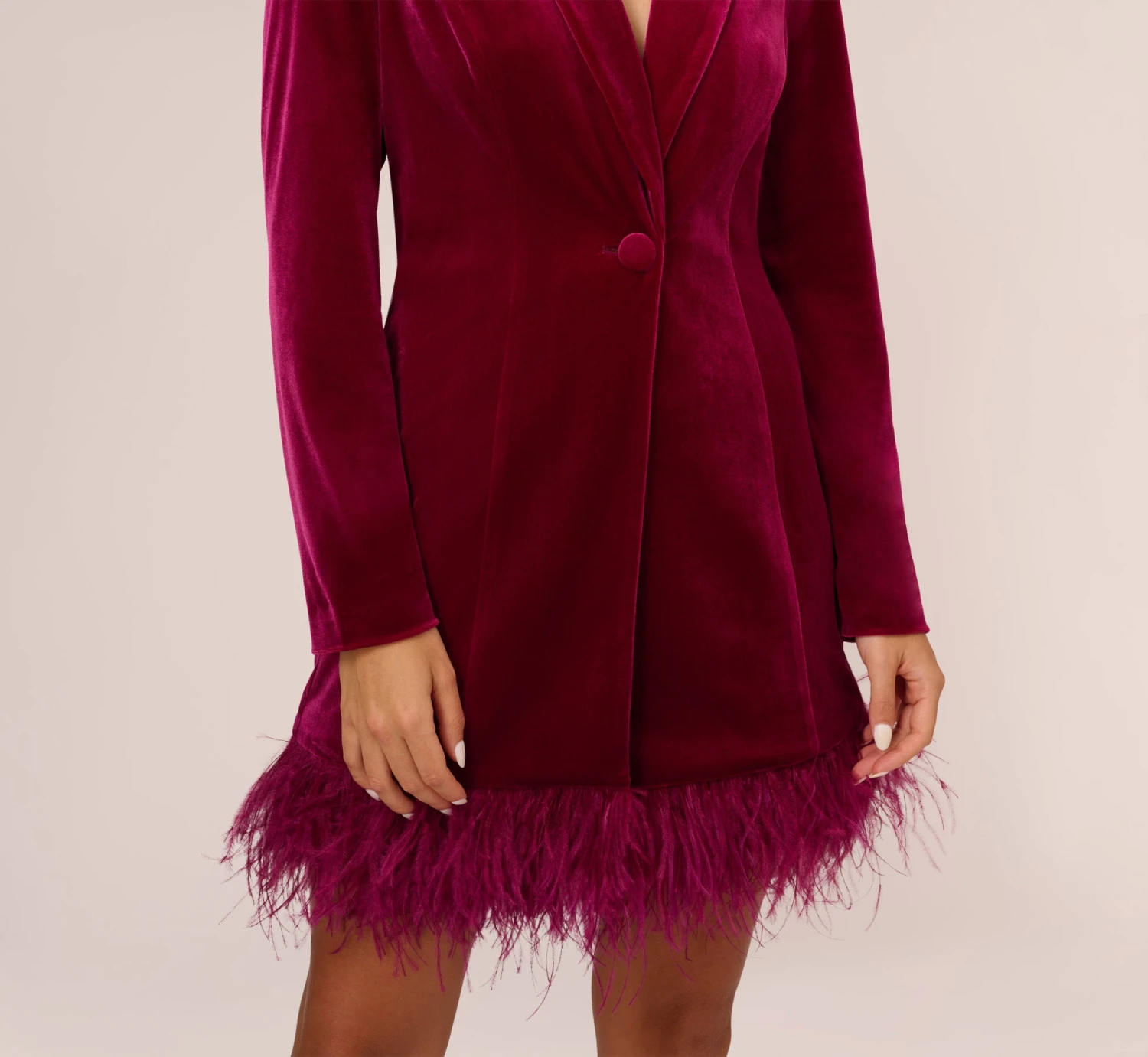 A modern take on the beloved Tuxedo Dress has arrived – and it’s a must-have. This cocktail dress features a tuxedo styling with lapels, a single self-button closure, long sleeves, and shoulder pads. Luxurious details like the velvet fabrication and the thick feather trim at the skirt hem add trend-forward notes to this Tuxedo Dress. Paired with a sparkling handbag and nude heels, this velvet dress scales from semi-formal to formal with ease.