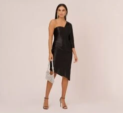 One Shoulder Satin Midi Dress With Three-Quarter Sleeve In Black