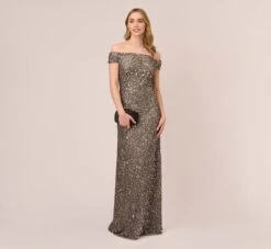 Adrianna Papell Floral Sequin Boho Gown With Lace Up Flutter Short Sleeves In Glacier