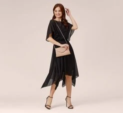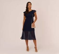 Adrianna Papell Chiffon And Jersey Flounce Draped Dress With Pleated Details In Midnight