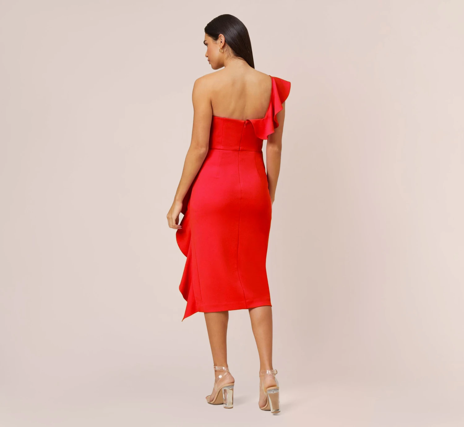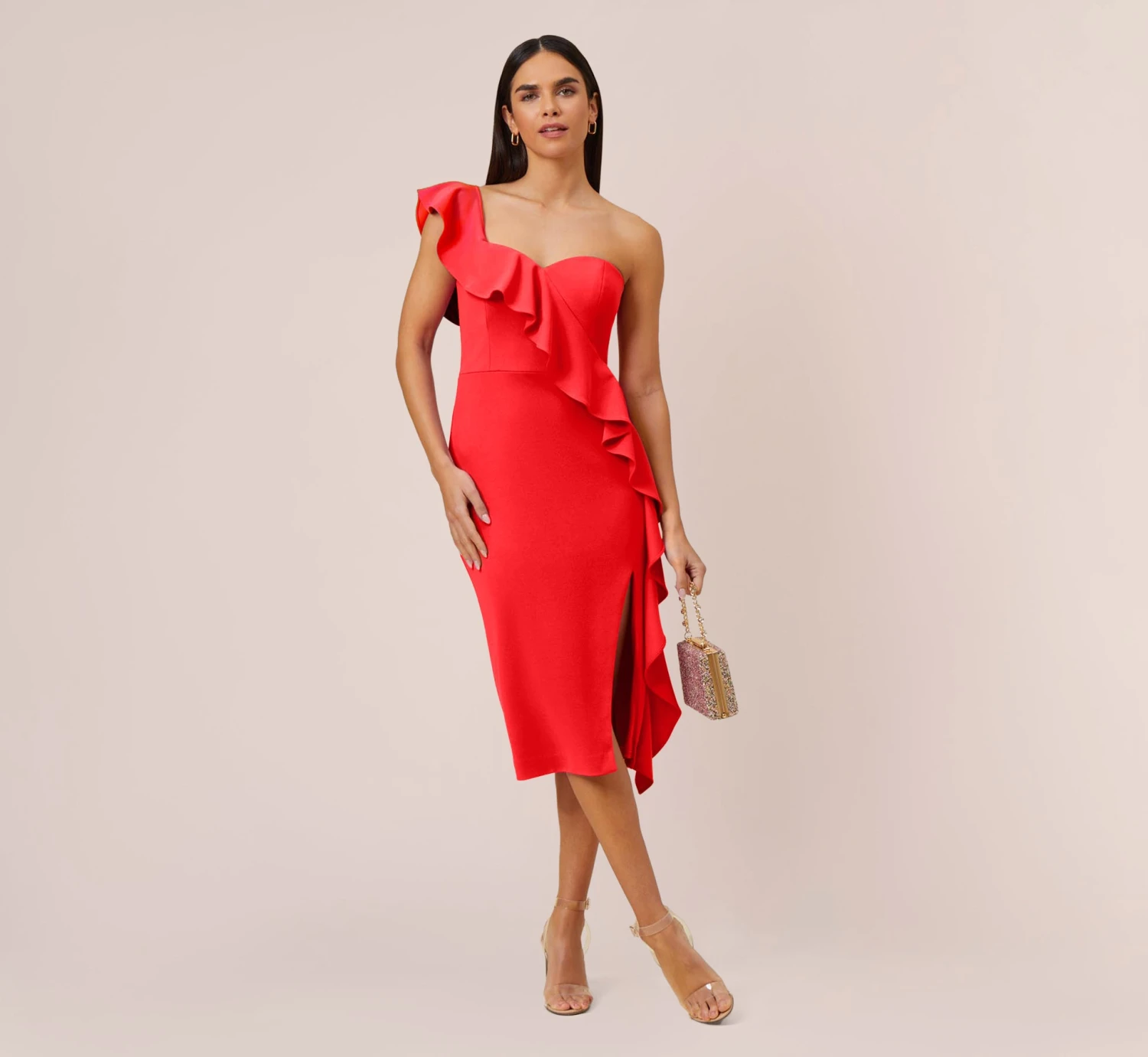 Made from a luxe stretch knit crepe fabric, this strapless sheath dress is designed with classic lines and a flirty ruffled accent to create a flattering and feminine silhouette. This stunning party dress features an adjustable single ruffled shoulder sleeve that can be worn on or off the shoulder and a feminine sweetheart neckline. The midi sheath skirt is complete with a slit for ease of movement. Back zipper with hook and eye closure. Amp up your look at prom, wedding receptions and any upcoming party on your calendar.
